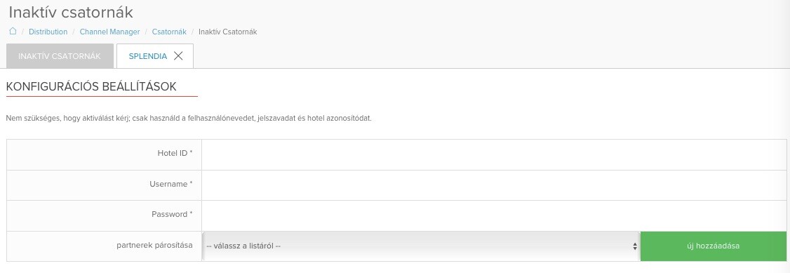 Amennyiben szeretnél csatlakozni a Splendia csatornához, a Sabee fiókodban navigálj a Distribution / Channel Manager / Inaktív csatornák / Splendia menübe és kattints Csatlakozás a csatornához gombra.