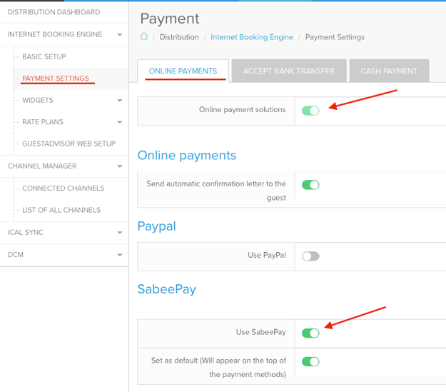 And, under Distribution > Booking Engine > Payment Settings, SabeePay now appears as an option in the Online Payment Solutions tab.