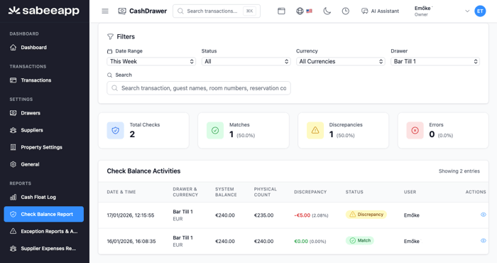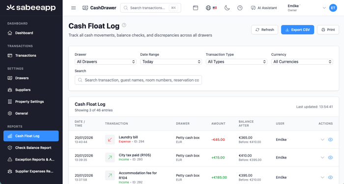 A Cash Drawer egy digitális készpénzkezelő rendszer, amelyet szállodák és szálláshely-üzemeltetők számára terveztek. Segít a csapatoknak a kasszaegyenlegek nyomon követésében, a készpénzmozgások rögzítésében, valamint teljes átláthatóságot biztosít műszakok, helyszínek, felhasználók és pénznemek között. A Cash Drawer valós idejű rálátást ad a készpénzkezelési folyamatokra, és minden tranzakcióhoz biztonságos, visszakövethető ellenőrzési nyomvonalat hoz létre.