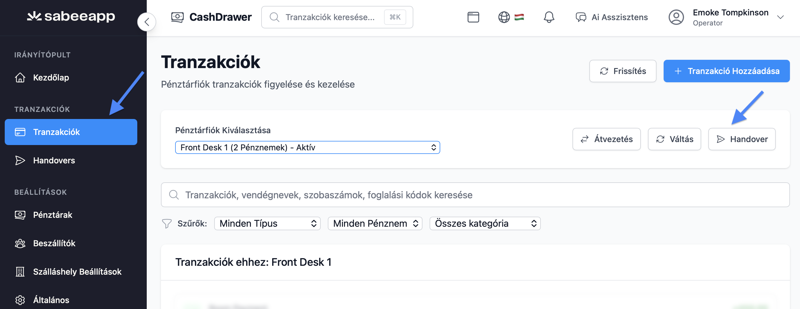Az átadásokat a Tranzakciók oldalon tudod indítani:
