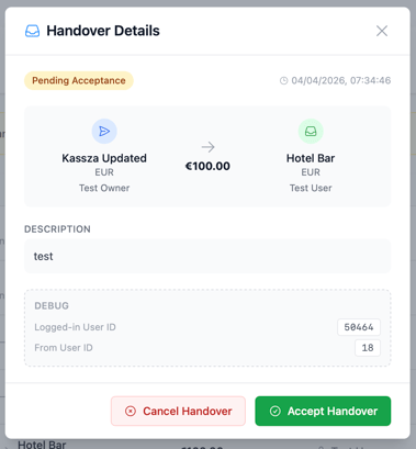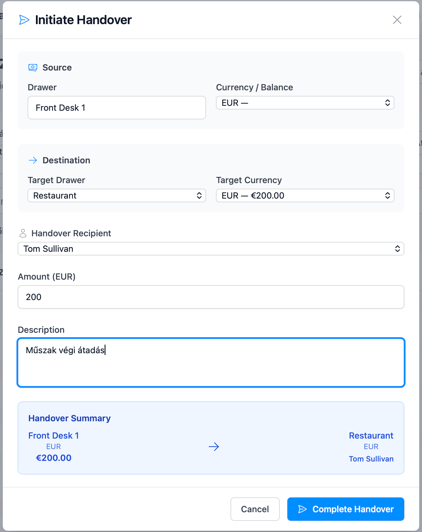 Az átadás egy formális pénzmozgás két pénztárfiók között, amelyet egy felhasználó indít, és a címzettnek kifejezetten jóvá kell hagynia. Nyomon követhető (auditálható) nyilvántartást hoz létre a munkatársak közötti pénzmozgásokról, így ideális műszakváltásokhoz vagy részlegek közötti átadásokhoz.