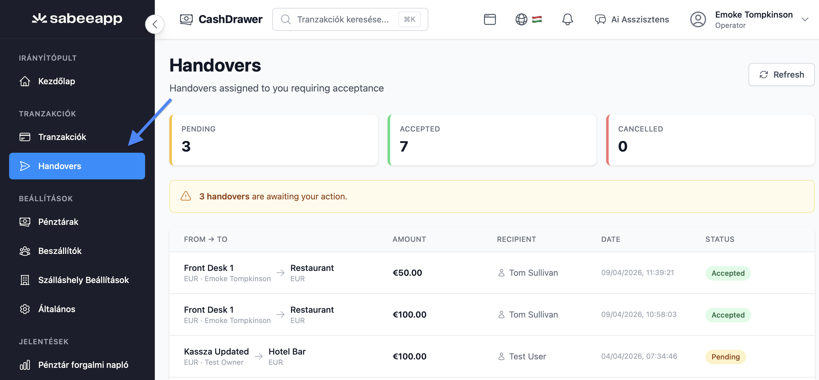 - Fejléc: Megmutatja, hány függő átadás vár a te műveletedre. Egy borostyánszínű figyelmeztetés jelenik meg: „X átadás vár a műveletedre.”