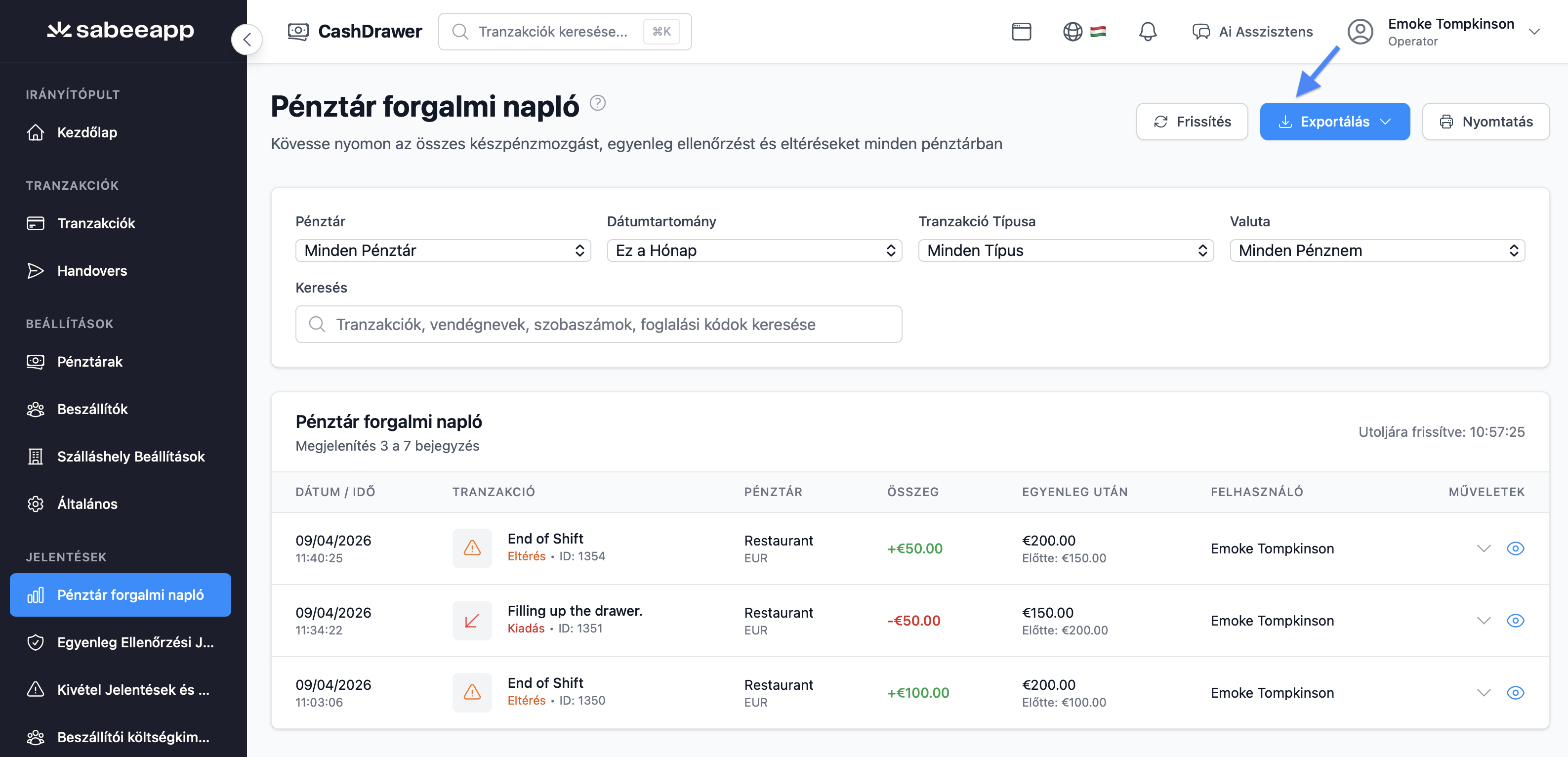 A Cash Drawer legtöbb adattáblája exportálható CSV vagy XLS (Excel) formátumba. Ez a funkció elérhető a Tranzakciók oldalon, valamint az összes Riport oldalon, így könnyedén elemezheted vagy megoszthatod az adatokat offline is.