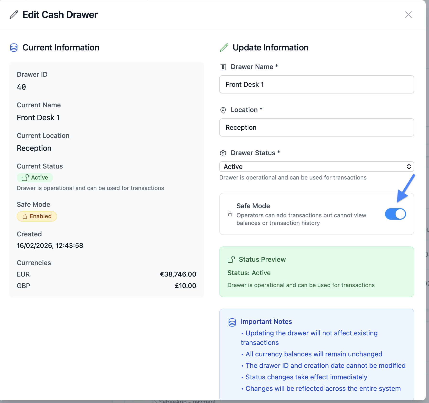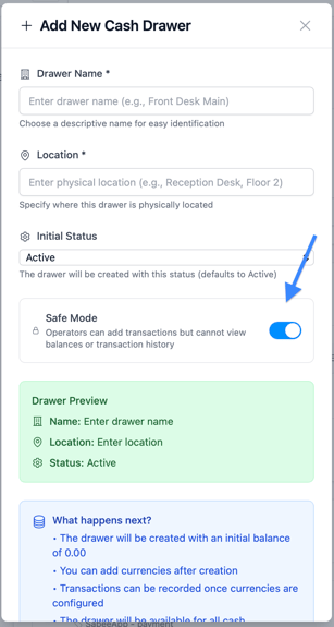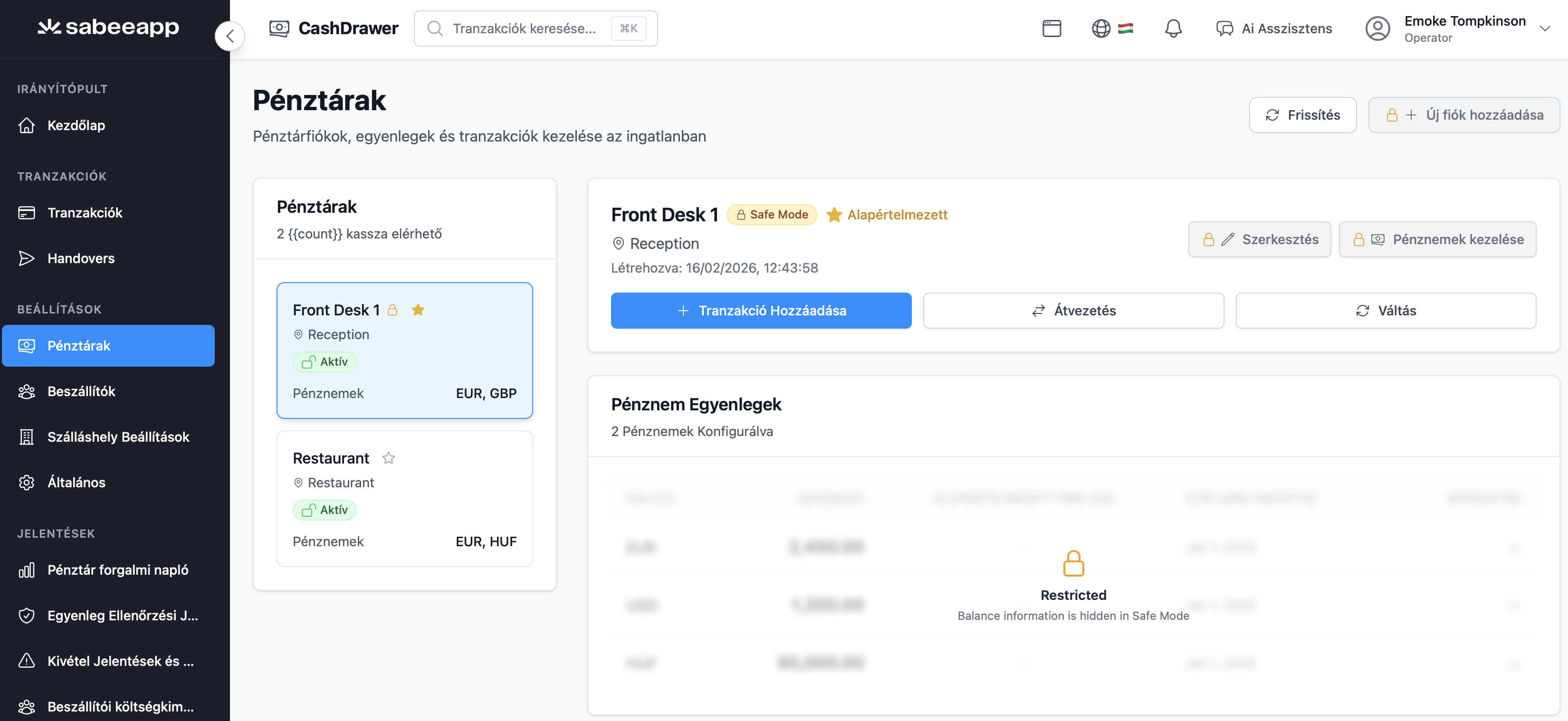 A Biztonsági mód egy adatvédelmi és biztonsági funkció bizonyos pénztárfiókokhoz. Ha be van kapcsolva, az operátorok rögzíthetnek tranzakciókat, de nem láthatják az adott fiók egyenlegét vagy tranzakciós előzményeit.