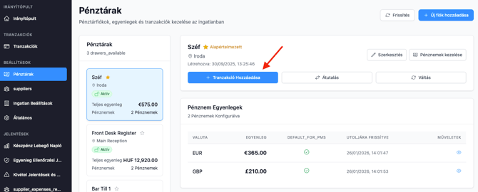 A Dashboardról (Irányítópult) kattints az Új tranzakció hozzáadása (Add Transaction) gombra, majd válaszd ki a forrás pénztárat