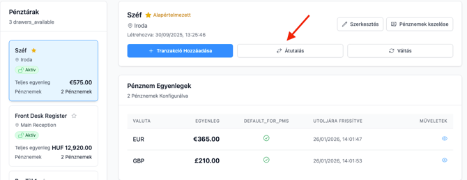- Lépj a Beállítások → Pénztárak menübe, és válaszd ki azt a pénztárat, ahonnan a pénzt átvisszük (Forrás)