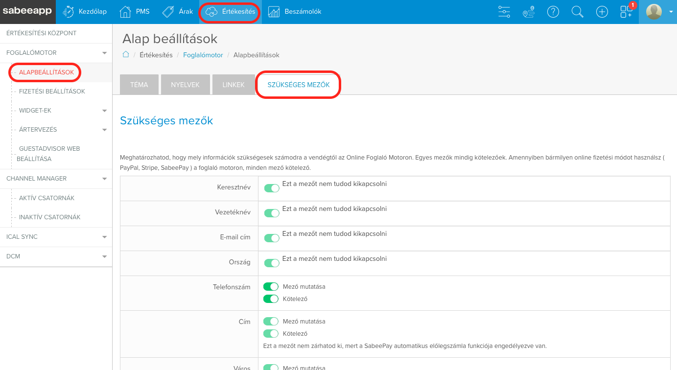 Értékesítés → Foglalómotor → Általános beállítások → Szükséges mezők