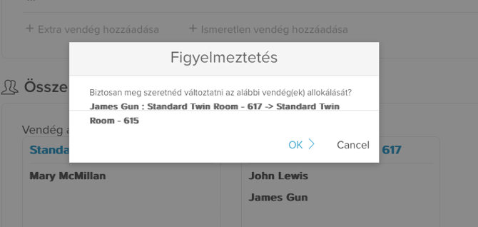 - Ha a foglalás tartalmaz "Extra vendég" profilokat, ezek automatikusan kiosztásra kerülnek a fizikai egységekbe, elsősorban az NTAK szinkronizációs követelmények miatt.