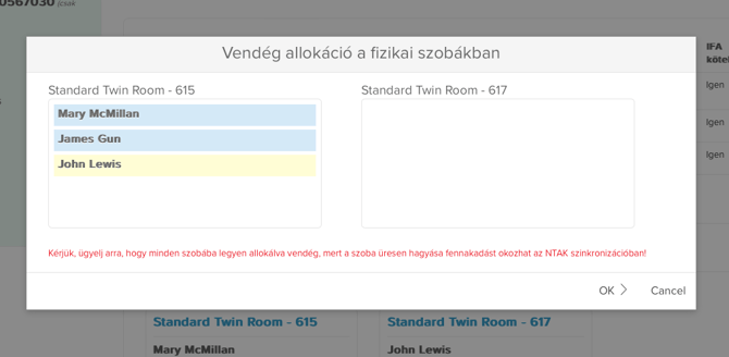 - A Szerkesztés gombra kattintva egy felugró ablak nyílik meg, ahol a felhasználók átrendezhetik a vendégprofilokat a fizikai szobák között.