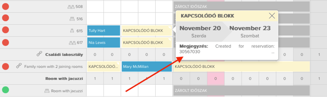 - Csoportos foglalások esetén, amikor a tagok foglalásai (egyéni foglalások) olyan fizikai egységekhez vannak rendelve, amelyek részei az Összenyitható szoba kapcsolatnak, a megfelelő blokkok megjegyzésként megjelenítik az összes tag foglalási azonosítóját.
