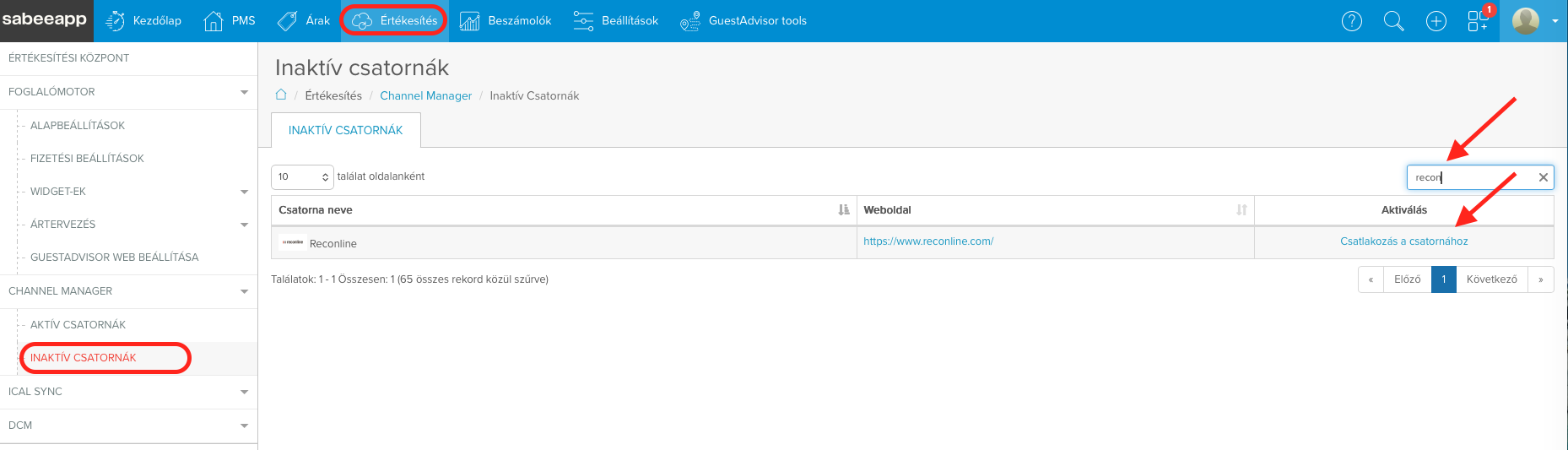 Értékesítés → Channel Manager → Inaktív csatornák -