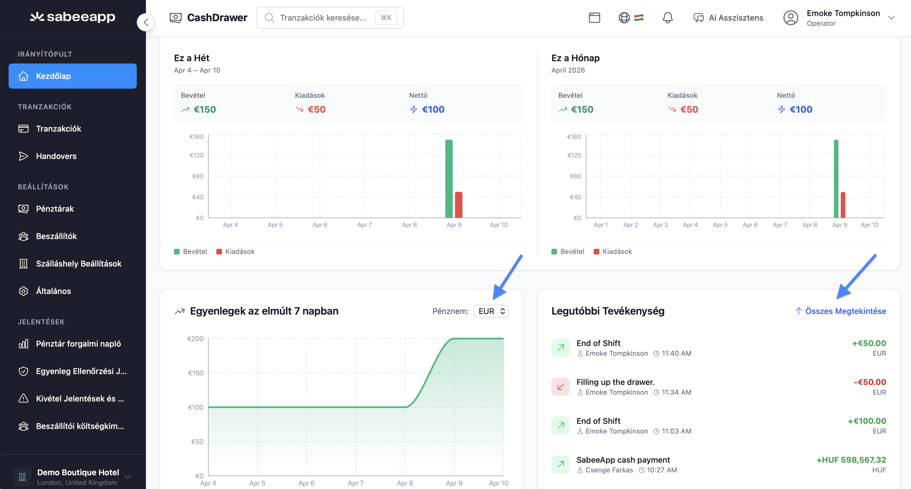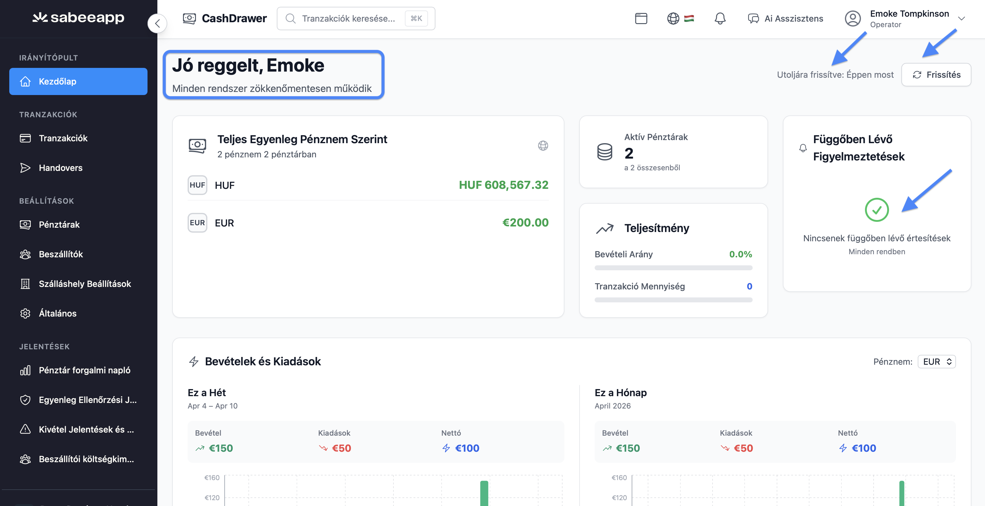 A Cash Drawer Kezdőlapja teljes, valós idejű képet ad a működésedről: egy helyen jeleníti meg a teljesítménymutatókat, egyenleg-összesítéseket, figyelmeztetéseket és a legutóbbi aktivitásokat. Úgy lett kialakítva, hogy hatékonyan tudd nyomon követni az üzleted működését, és gyorsan megalapozott döntéseket hozhass.