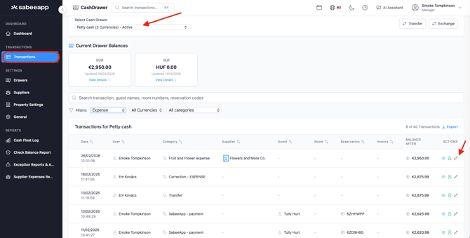 Rögzített tranzakció módosítása és törlése a Cash Drawerben