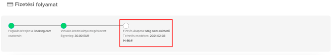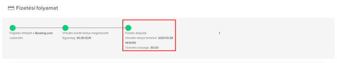 Miután a kártya terhelése megtörtént, a a Fizetés állapotának lépése is zöld színt kap, valamint közvetlenül alatta megjelenítjük a tranzakció időpontját valamint összegét.