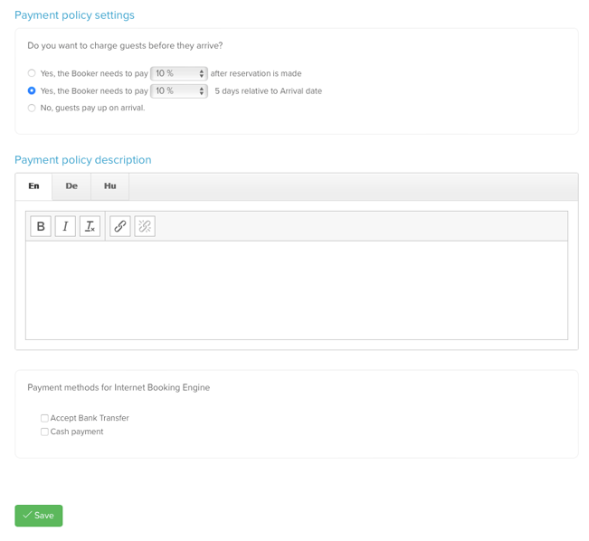 - Prepayment Before Arrival: Define a percentage or the first night’s fee, to be paid a certain number of days before arrival.