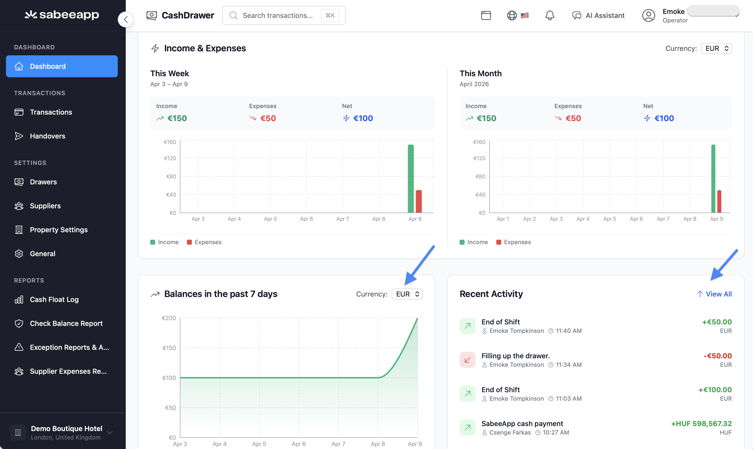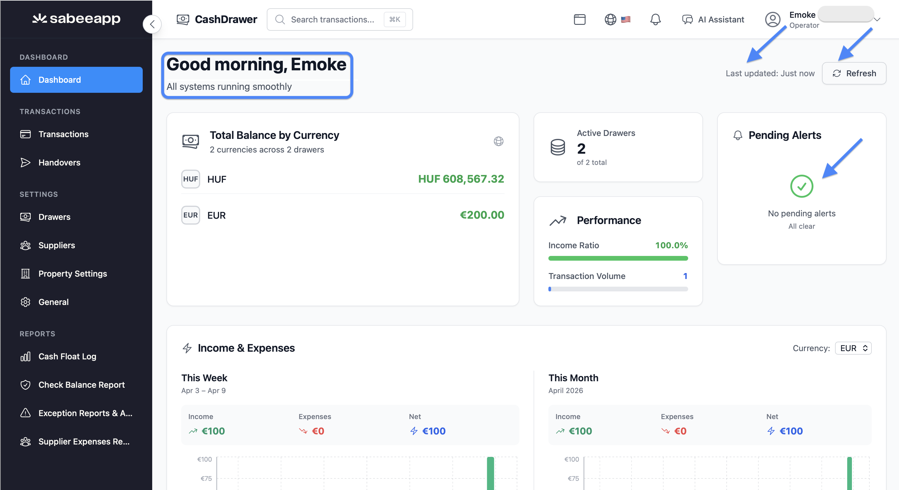 The Dashboard provides a complete, real-time view of your operations, combining performance metrics, balance summaries, alerts, and recent activity—all in one place. It is designed to help you monitor your business efficiently and make informed decisions quickly.