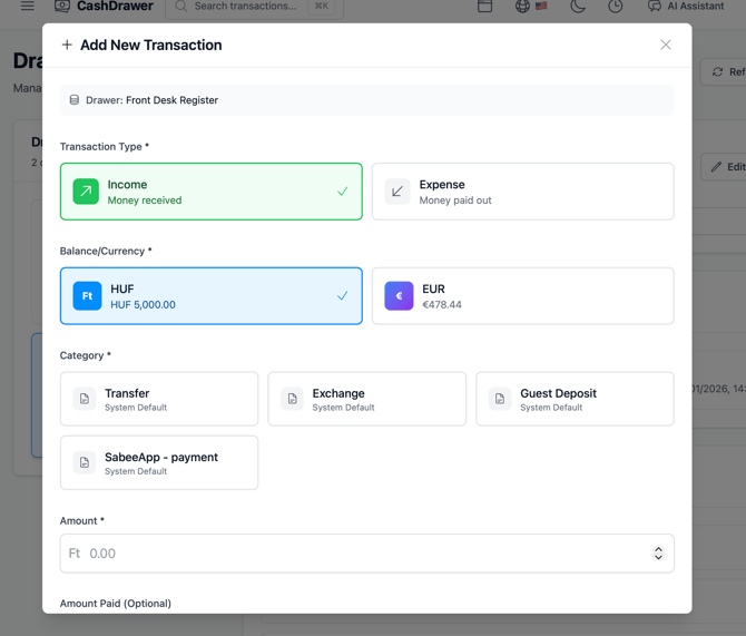 You can add a starting balance in two ways. The most common method is to record it as an income transaction for the money already in the physical drawer. To do this, you first need to create an Opening Balance transaction category.