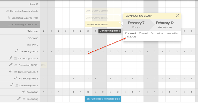 When the shared inventory feature is activated, and the room setup and linkage are finalised, the system will automatically create blocks ( or connecting blocks) in the virtual units corresponding to existing reservations in the linked physical rooms.