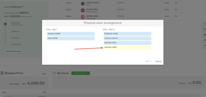 Clicking Edit opens a popup window where users can rearrange guest profiles between physical rooms.