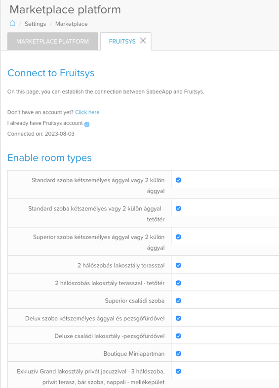 Once the connection is established, you can choose which room types and services you’d like to synchronise between SabeeApp and Fruitsys.
