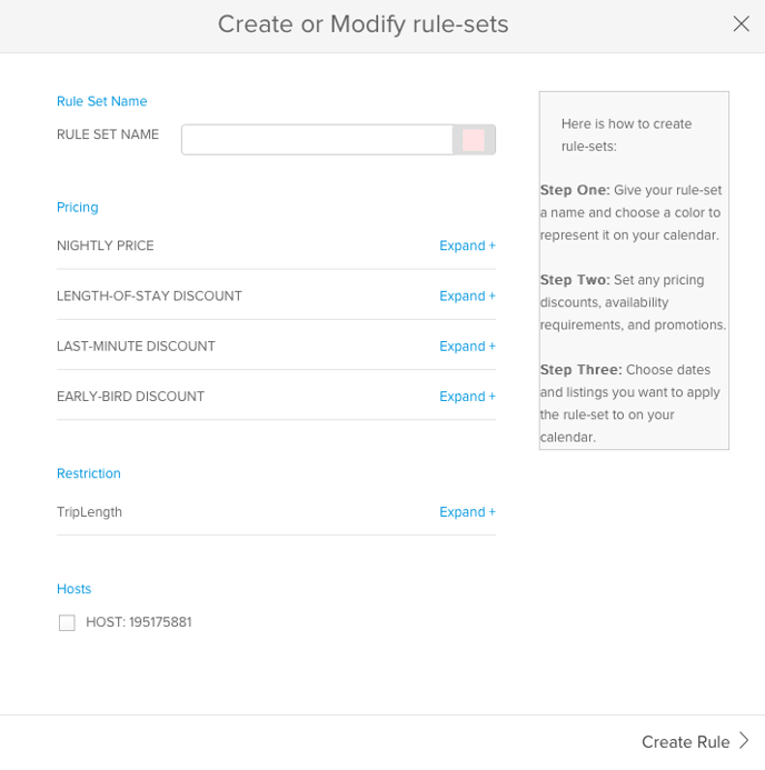 First, you have to give a name and choose a color of your rule-set. This is how it will appear in Airbnb's extranet.