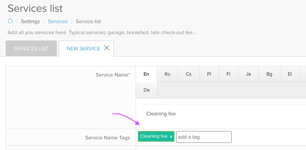 Enter the exact service name from Booking.com in Service Name Tags (e.g., Cleaning fee).