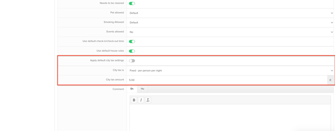 “Apply default city tax settings” toggle in the room type configuration must be turned off (greyed out). This allows unique city tax rules to be assigned to selected units.