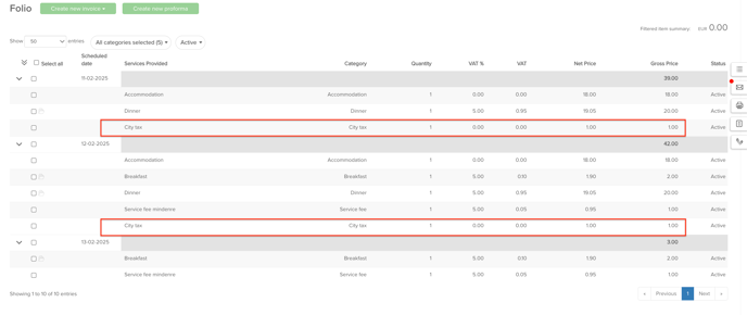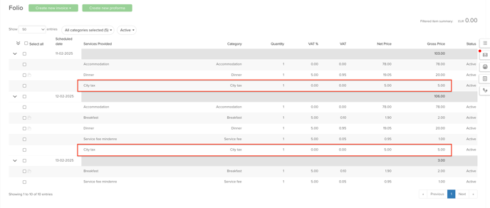 - New Room: Bungalow (5 EUR/person/night) → Folio updates to 10 EUR city tax.