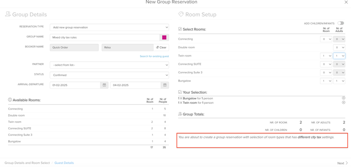 - Manual Group Creation: Each reservation in the group follows the city tax rules of its assigned room type. A notification popup informs users about the mixed tax setup.