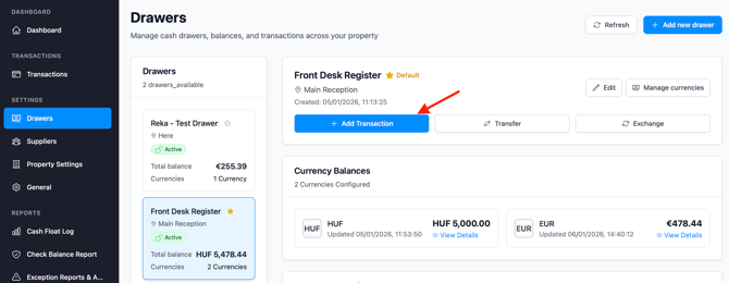 A transaction is a record of money moving into or out of a cash drawer. Any time cash changes hands—whether it’s income, an expense, a transfer between drawers, or a currency exchange—a transaction is created.