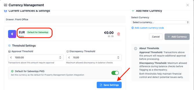 This determines which drawer receives SabeeApp cash payments for that currency.