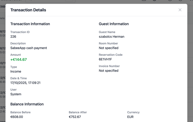 - Transactions can be added manually or automatically via SabeeApp PMS