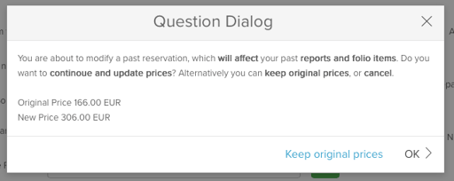 Warning: "You are about to modify a past reservation, which will affect your past reports and folio items. Do you want to continoue and update prices? Alternatively you can keep original prices, or cancel."