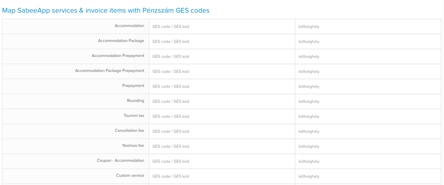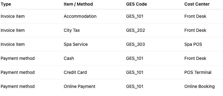 - Example: Accommodation → GES_101, City Tax → GES_202, Spa Service → GES_303