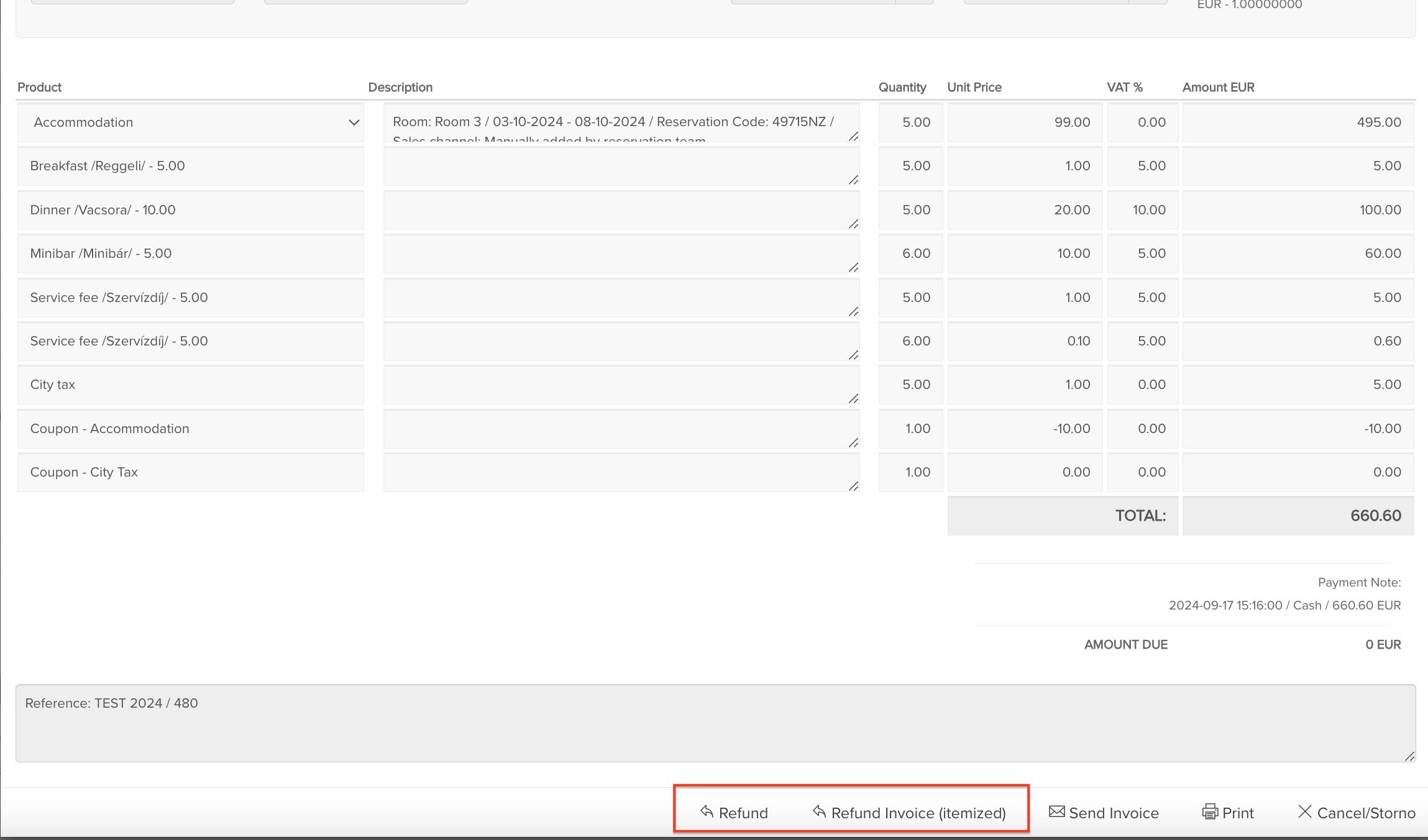 Once the invoice is marked as paid, we initiate an itemized refund, because we would like to refund only 2 nights from the 6. We will see the following, after pressing the " Refund ( itemized ) button: