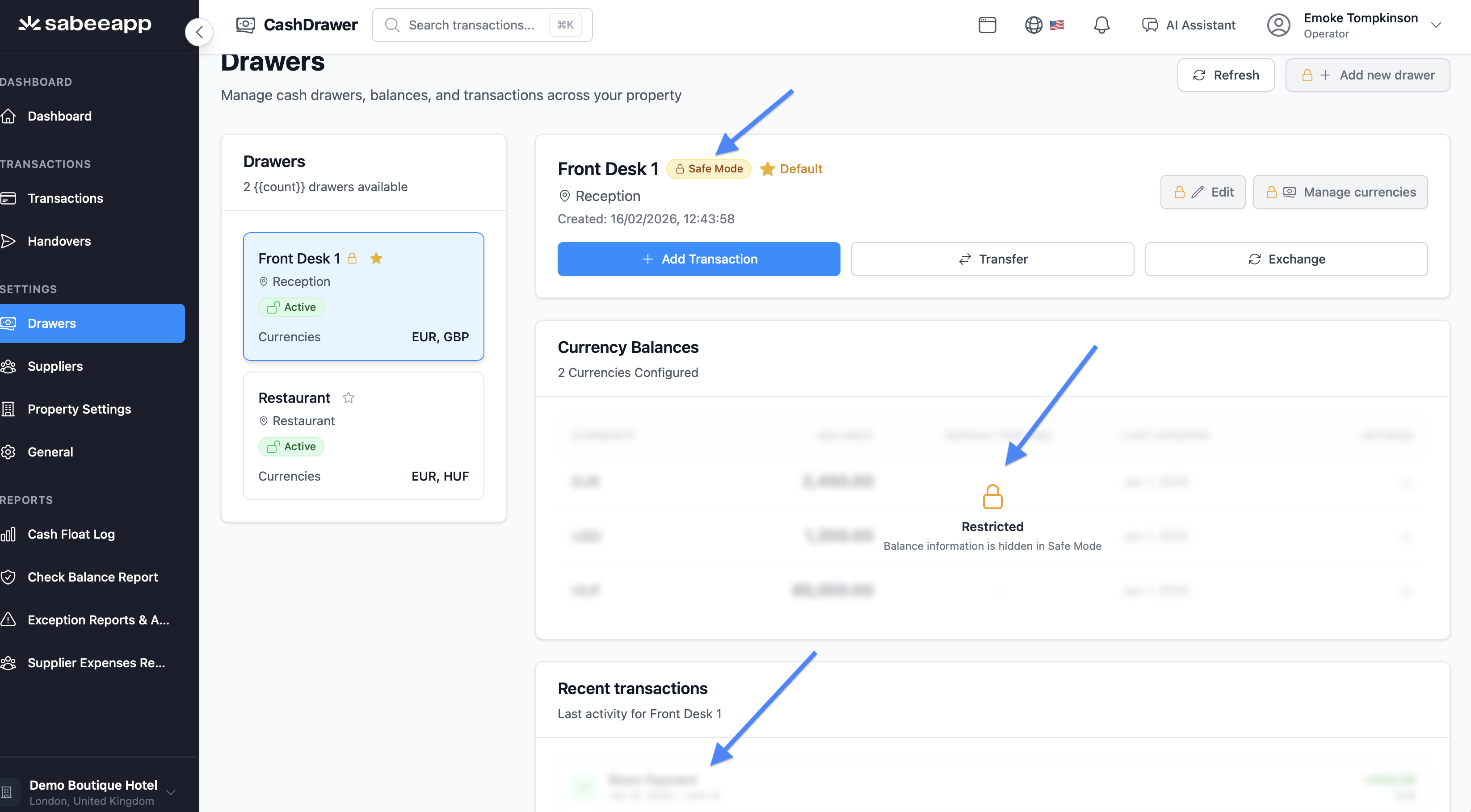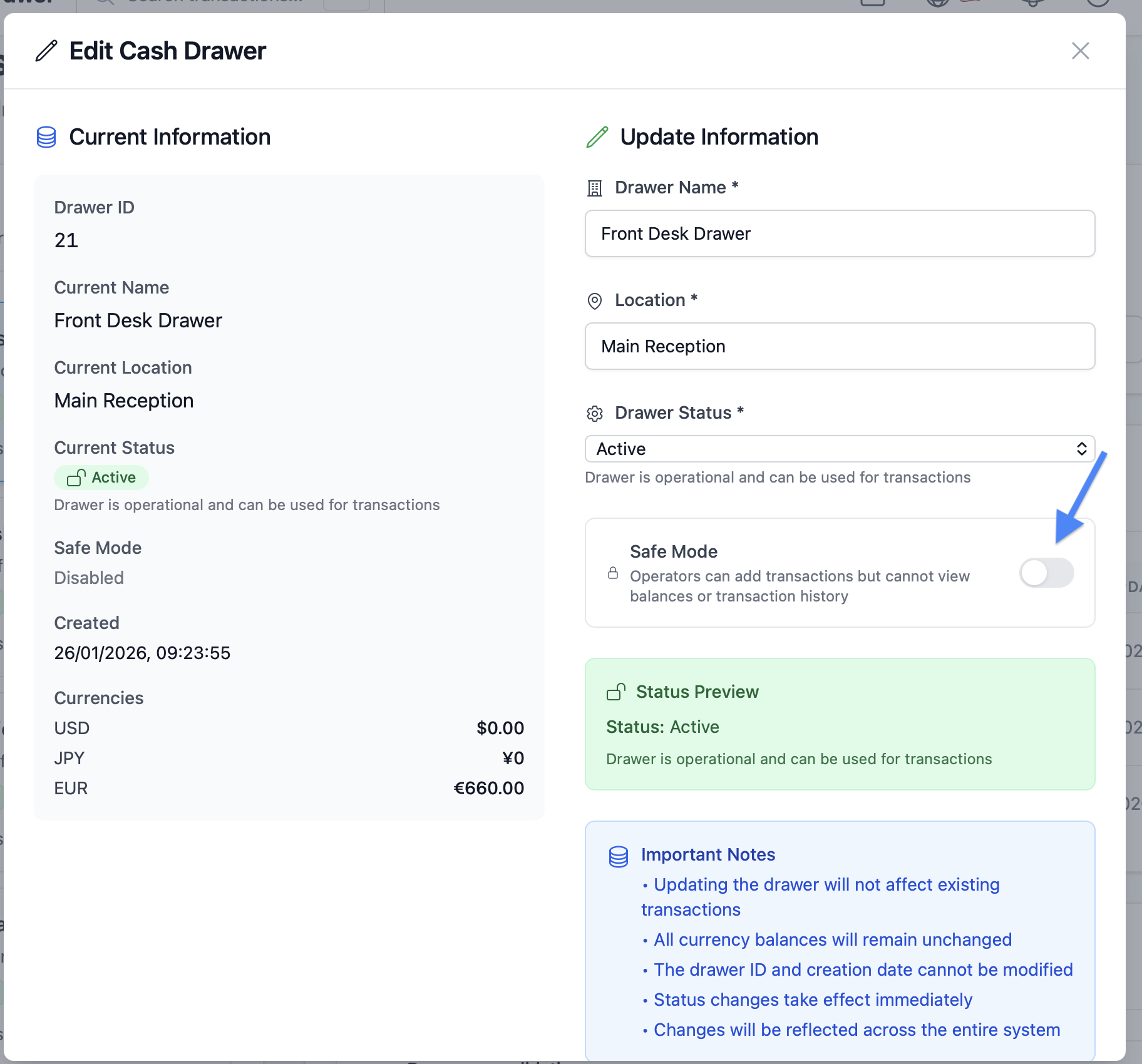 Safe Mode is a privacy and security feature for specific drawers. When enabled Operators can add transactions but cannot view balances or transaction history for that specific drawer.