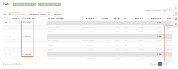 In case there was only payment created before the split, the Folio items will be routed to the group Folio, their status will be Routed. In case there was an invoice issued as well ( containing the Folio items ), the status of these Folio items after the split will be Group billed ( since the invoice is also considered as a group invoice ).