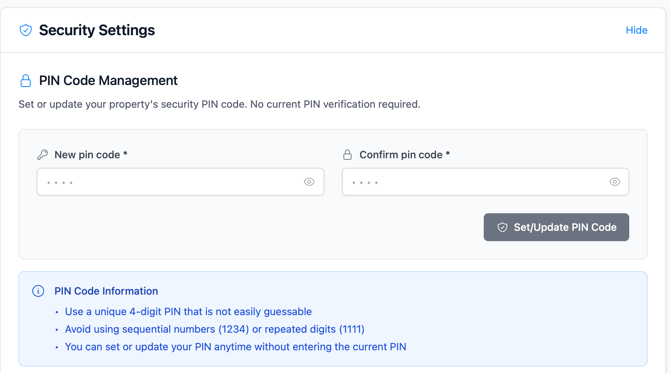 Set in Property Settings → Security Settings. Only the account owner should use this PIN.