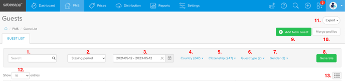 The Guest List interface provides several tools and filters to help you locate and manage guest data efficiently: