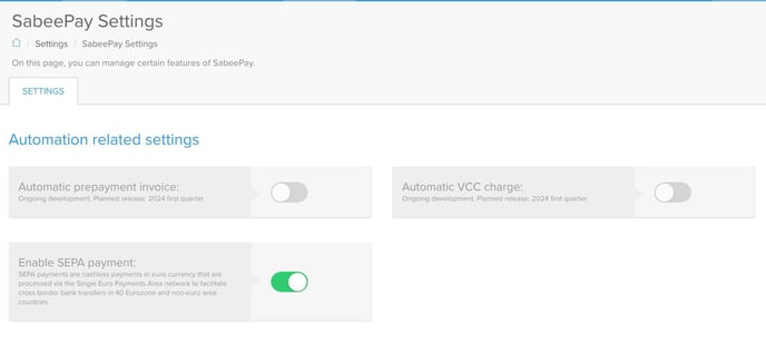 - Activate SEPA payment method in the SabeeApp account: There is an "Enable SEPA payment" toggle in the Settings/SabeePay menu in the automation section, which is initially in the off position. If you slide this toggle, the new payment method will appear on the IBE and the CP.