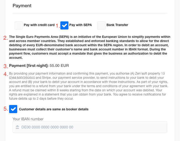 1. Guests can now choose the "Pay with SEPA" option during the booking process.