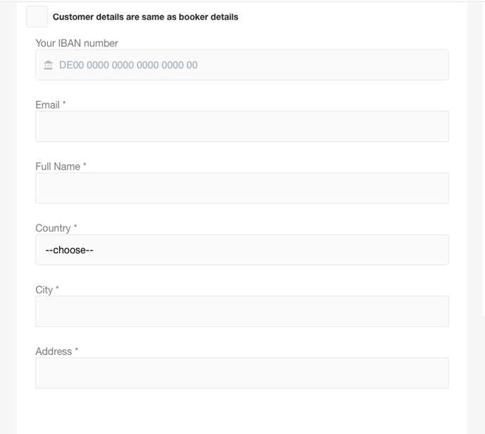 5. Next, we present the "Customer details are same as booker details" checkbox. This checkbox is initially checked. When checked, only the IBAN number field is displayed, and the necessary data for submission is taken from the Booker details section.