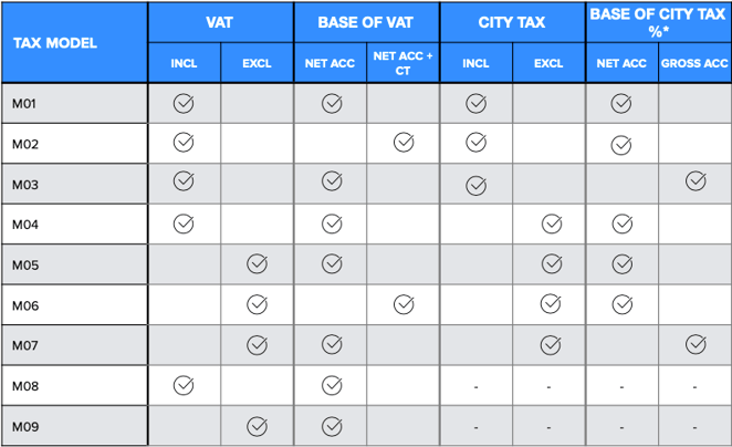 Once you have selected the correct Tax model, you need to define the VAT and City tax: