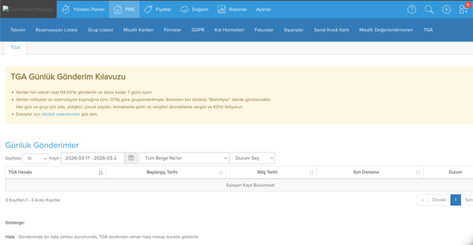 - PMS / TGA menüsünde, gönderilen kayıtların listesi bulunur, gönderim ve hata takibi yapılabilir.
